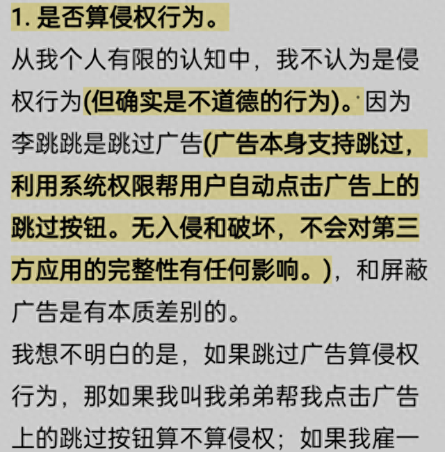 开发者也表示,自己这样的行为,客观上确实可能导致某大厂广告收入减少,但并不涉及侵权,仅仅是不道德的行为。“到头来李跳跳没有了,部分厂商不规范、不合理的行为却依旧存在。如果所有厂商都把开屏广告上的跳过按钮,做成全屏跳过,那需要使用李跳跳的用户还会有多少呢?”开发者介绍,自己公益开发该软件的初衷,还是因为厂商强制开屏广告时不规范设置跳过按钮的问题,但如今厂商仅想着解决开发者,而不想着规范自己的广告行为。