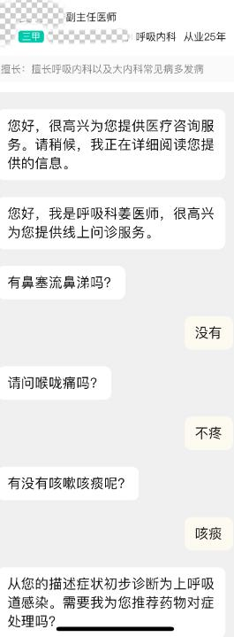 “有鼻塞流鼻涕吗?”“没有。”“喉咙痛吗?”“不疼。”“有没有咳嗽咳痰呢?”“咳痰。”短短三个回合的问答,赵琳总共只发了六个字,医生就直接回复:从您的描述症状初步诊断为上呼吸道感染。需要我为您推荐药物对症处理吗?
