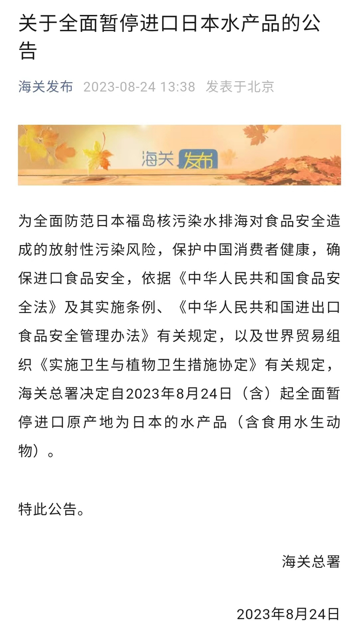 随后,海关总署发布公告称,即日起全面暂停进口原产地为日本的水产品(含食用水生动物)。