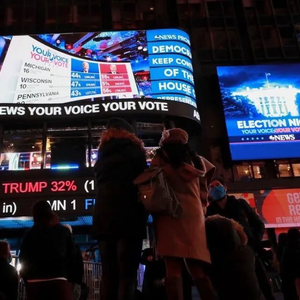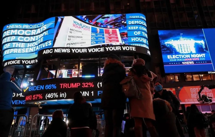 ·2020年11月3日,人们在美国纽约时报广场观看总统选举实时计票结果。(图源:新华社)