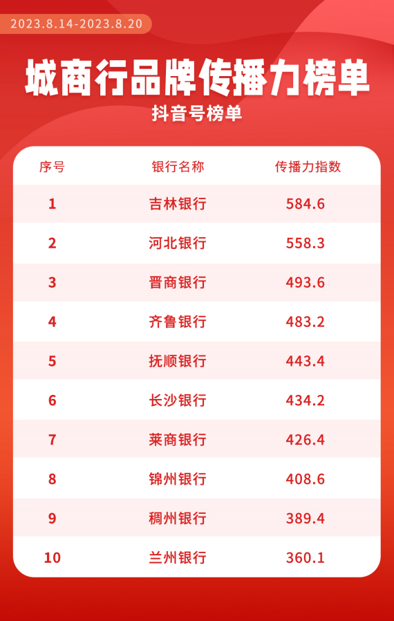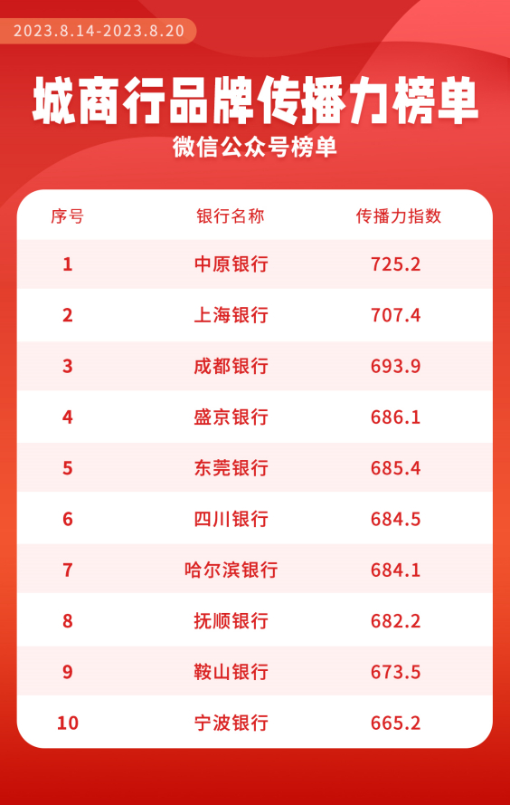 “城商行品牌传播力”周榜发布!来看哪些银行上榜