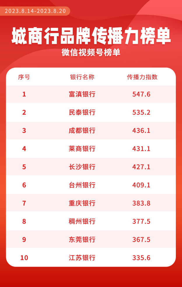城商行品牌传播力视频号前十榜单