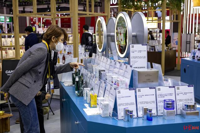 2022年11月,上海,第五届进博会消费品展区,参观者体验日本化妆品。 据ICphoto