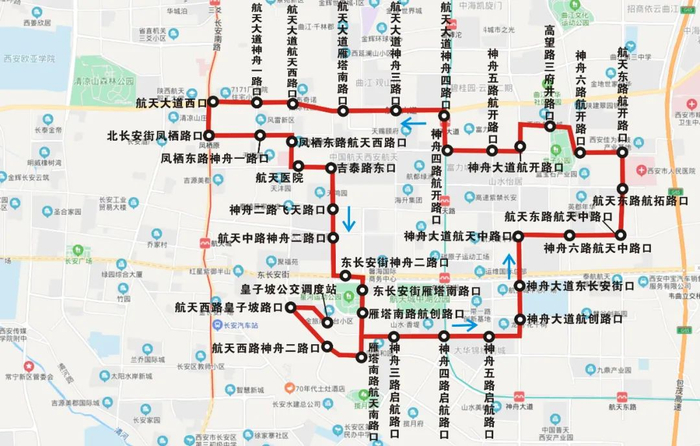 线路设置临时站点35个:皇子坡公交调度站、航天西路皇子坡路口、航天西路神舟二路口、雁塔南路航天南路口、神舟三路启航路口、神舟四路启航路口、神舟五路启航路口、神舟大道航创路口、神舟大道东长安街口、神舟大道航天中路口、神舟六路航天中路口、航天东路航天中路口、航天东路航拓路口、航天东路航开路口、神舟六路航开路口、高望路三府井路口、神舟大道航开路口 、神舟五路航开路口、神舟四路航开路口、航天大道神舟四路口、航天大道神舟三路口、航天大道雁塔南路口、航天大道航天西路口、航天大道神舟一路口、航天大道西口、北长安街凤栖路口、凤栖东路神舟一路口、凤栖东路航天西路口、航天医院、吉泰路东口、神舟二路飞天路口、航天中路神舟二路口、东长安街神舟二路口、东长安街雁塔南路口、雁塔南路航创路口。