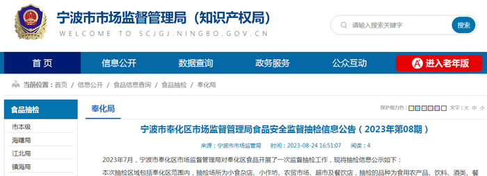 中国质量新闻网讯 近日,浙江省宁波市奉化区市场监督管理局发布食品安全监督抽检信息公告(2023年第08期)。