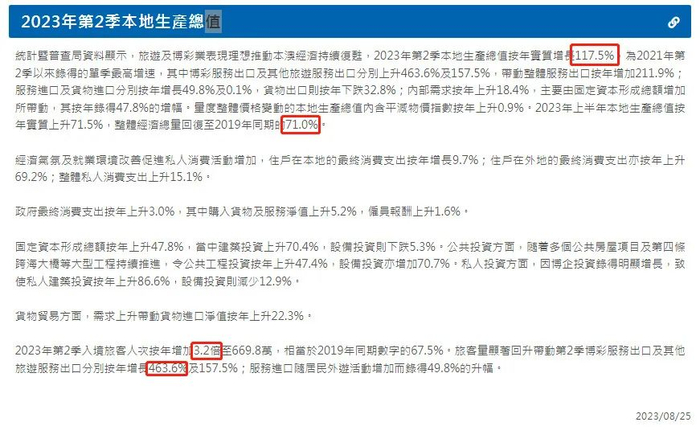 8月25日,澳门统计暨普查局公布澳门2023年第二季本地生产总值显示,今年第二季度,澳门生产总值按年实质增长117.5%,为2021年第二季以来录得的单季最高增速。