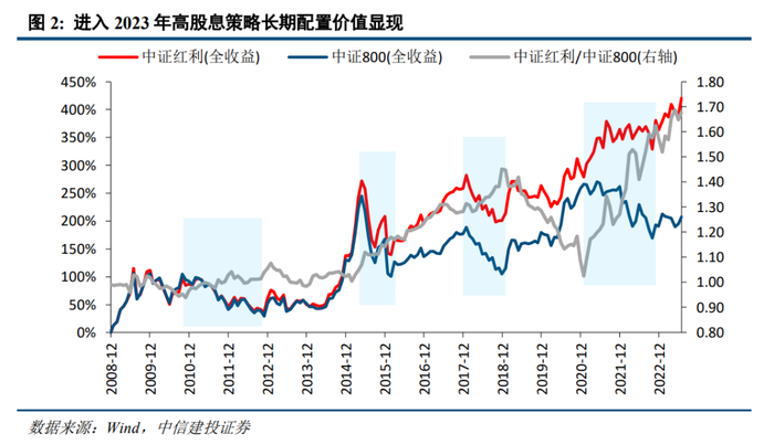 因此无论是在经济基本面出现恶化导致市场整体长期阴跌(2011-2012年、2018年、2022年),还是市场估值较高出现中期维度的持续调整(2015下半年、2021年)的情况下,中证红利指数都跑赢中证800指数,在市场弱势期中,高股息策略防御属性强,依旧可以为投资者带来稳定的盈利和分红。这也是我们去年年初关注高股息策略的核心原因。