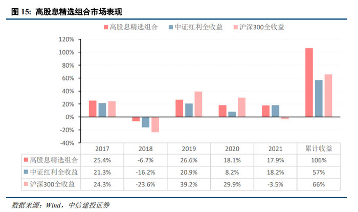 符合条件的公司按当年预期股息率降序排列取前十名,并参照中证红利指数按当年预期股息率进行加权。结果显示这一策略在过去5年里(2017-2021年)取得了106%的收益,除2021年小幅跑输0.3%之外每年均跑赢中证红利全收益指数,5年间相对中证红利全收益指数超额收益49%,相对沪深300全收益指数超额收益40%。