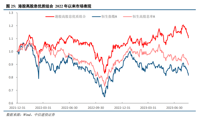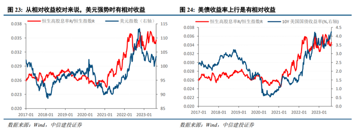 不过,如果我们考察港股高股息策略的相对表现,观察恒生高股息率R/恒生指数R的走势,则会发现高股息策略的相对收益与美元指数、美国国债收益率呈现正向关系。这是由于高股息标的属于短久期资产,在美国国债收益率提升,美元走强,流动性紧张的大背景下相对恒生指数、恒生科技具有更强的防御属性。因此在美元走强时港股高股息策略往往能够获得相对收益。
