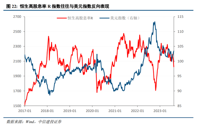 由于港股的特殊性——作为全球性市场,外资影响力大,容易受到全球宏观流动影响,港股高股息策略的表现与美元指数呈现出明显的反向关系,即当美元指数走强时,美元回流美国,港股流动性紧张,市场出现下跌,高股息策略同样受到影响,而当美元指数走弱时,港股流动性好转,高股息策略明显走强。