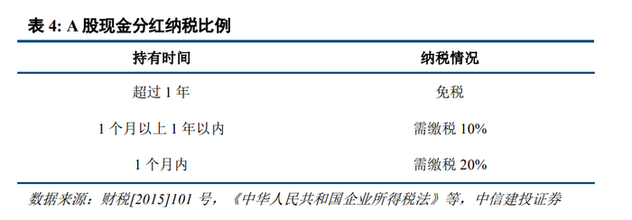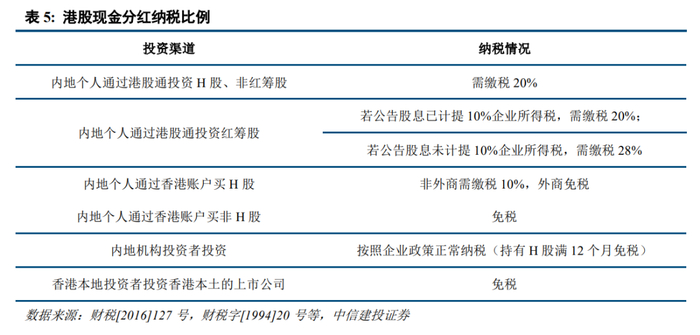 港股股利投资的税收机制与A股投资有所不同。A股现金分红的纳税比例与持有时间有关,持有超过1年/1个月均有不同程度免税激励。港股股利的税收机制则与投资渠道密切相关,通过港股通投资/香港账户投资,分红公司是H股或红筹股,税收机制均有不同。详见下表所示。