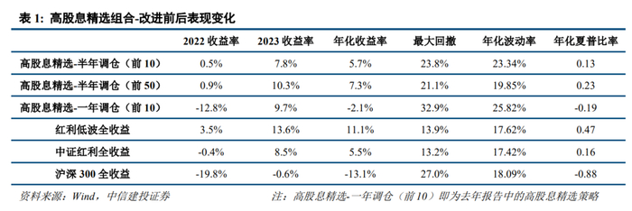 改进思路:第一种改进思路是在原有高股息选股策略的基础上,提高每年选股调仓的频率。事实上,高股息策略并非一种高频策略,中证红利指数每年进行一次指数样本调整,中证红利低波指数则是每半年一次调整,其他红利指数也基本都以年度、半年度或季度为频率进行调整。因此,考虑到调仓成本和组合管理的便利性,我们决定保持原有“高股息精选”策略选股标准,在每年年底和6月30日收盘后重新进行筛选和调仓。