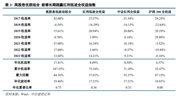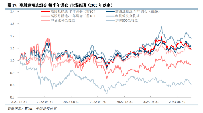 那么,我们的高股息精选组合实战效果如何?我们以上述选股标准在2022年和2023年年初进行两次筛选,构建高股息精选组合且每年进行一次调整。回测结果显示:截至8月18日,高股息精选组合下跌3.73%,相比沪深300全收益约能获得16%的超额收益。