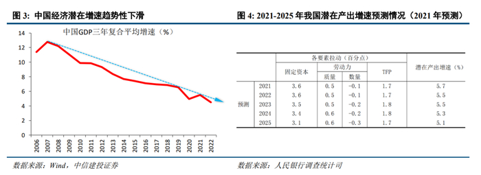 第一,宏观经济形势与过去不同,经济增速降档、长期利率下行已经较为明确。参考东亚经济体经济发展和转型历史,经济高速增长后会进入转型阶段,潜在产出水平会逐步下降,表现为经济增速降档的特征。该趋势在2007年以来已经较为明显,根据2021年人民银行调查统计司工作论文《“十四五”期间我国潜在产出和增长动力的测算研究》的预测,2021-2025年我国潜在产出增速将不断下滑。事实上,2020年后受到疫情冲击影响,我国经济增速在一些时期未能达到潜在产出水平。今年两会将经济增长目标定为“5%左右”,相比2021年预测的潜在产出水平,已有明显下调。