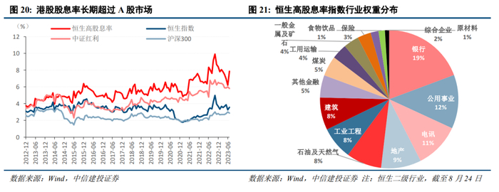 除了在A股市场中日益受到投资者关注外,港股市场也是众多长期投资资金进行高股息策略投资的重点方向。这是由于港股市场股息率长期以来维持较高水平,且明显超过A股市场,堪称“股息率高地”。特别是由于A/H股溢价的存在,H股估值往往更低,能够获得更高的红利收益。例如8月24日收盘,农业银行A股股息率为6.4%,港股股息率为9.45%,差异明显。与之类似的,恒生高股息率指数和恒生指数的股息率长期大幅超过中证红利指数和沪深300指数,目前恒生高股息率指数股息率已经达到8.39%。