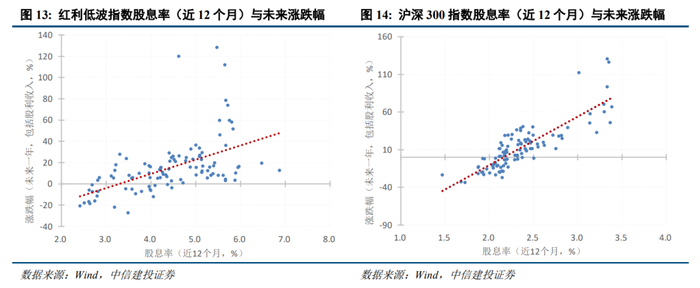 第二,从历史经验来看,较高的股息率(近12个月),往往对应较高的未来一年涨跌幅(包括股利收入)。我们可以将中证红利、红利低波、沪深300等指数过去一年股息率和未来一年涨跌幅水平做散点图进行观察(2013年12月以来,取月度数据),可以发现较为明显的正相关关系。由散点图中揭示的线性关系,或将表明以当前较高的股息率水平,未来一年指数将获得较大的上涨(包括股利收入)。