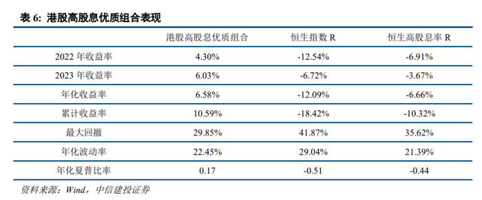 港股市场也是众多长期投资资金进行高股息策略投资的重点方向。这是由于港股市场股息率长期以来维持较高水平,且明显超过A股市场,堪称“股息率高地”。我们构建港股高股息优质组合,去年年初以来组合累计收益达到10.59%,大幅跑赢恒生指数R和恒生高股息率R在市场下跌中表现稳健。最大回撤控制在30%以内,年化夏普比率为0.17。