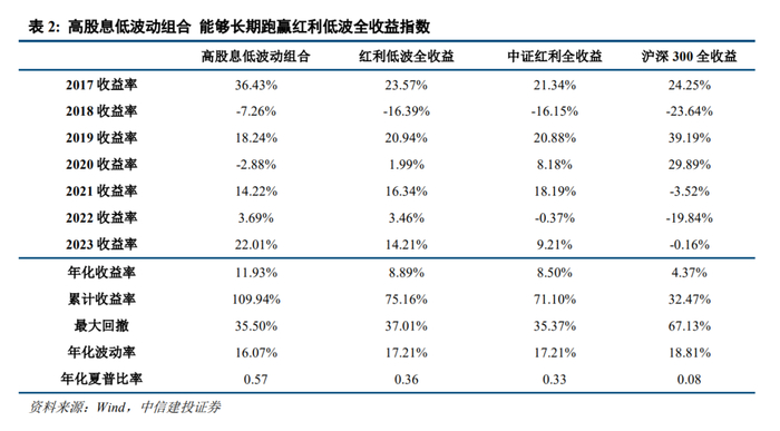 改进表现:在引入股价波动率作为核心筛选指标后,我们构建的高股息低波动组合表现较好。在2017-2018, 2022-2023年跑赢红利低波和中证红利指数,仅2019-2021三年间略有跑输。总的来看,2017年年初以来,高股息低波动组合累计收益率达到109.94%,大幅超过红利低波全收益和中证红利全收益的75.16%和71.10%,年化收益率高达11.93%。同时最大回撤控制在35.5%与中证红利全收益相当,年化波动率也小于其他三个指数。总体来看,我们的高股息低波动组合2017年以来年化夏普比率达到0.57,全面优于红利低波全收益、中证红利全收益和沪深300全收益指数。
