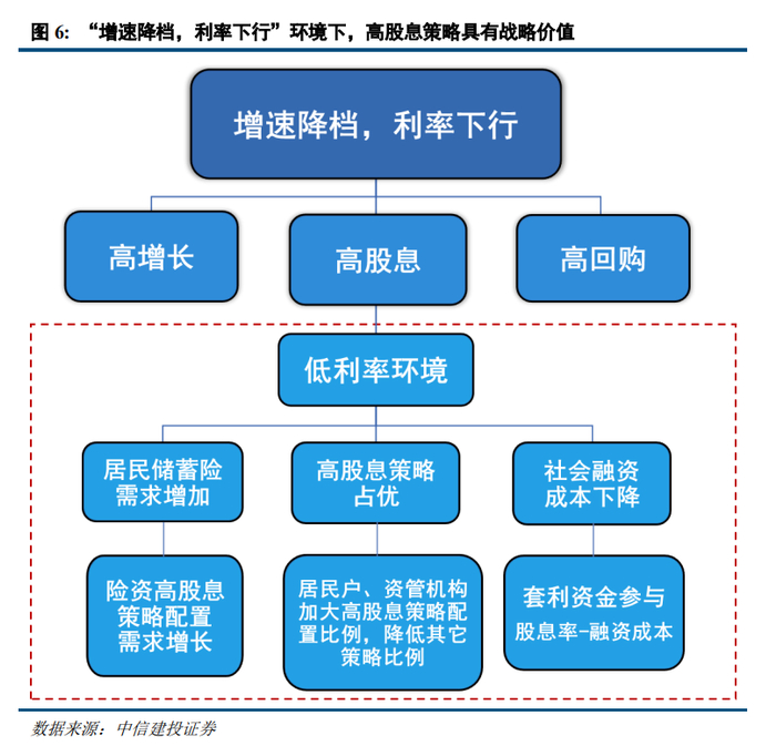 总的来说,我们认为在“增速降档,利率下行”环境下,高股息策略正在展现出战略价值。