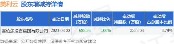 8月25日美利云发布公告《美利云:关于持股5%以上股东减持后持股比例低于5%的提示性公告》,其股东赛伯乐投资集团有限公司于2023年8月14日至2023年8月22日间合计减持695.26万股,占公司目前总股本的1.0%,变动期间该股股价上涨6.55%,截止8月22日收盘报11.88元。