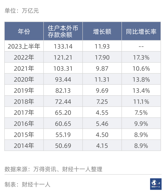 表1:2014年-2023年上半年住户本外币存款余额与增长情况