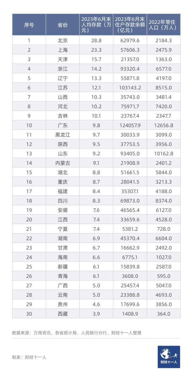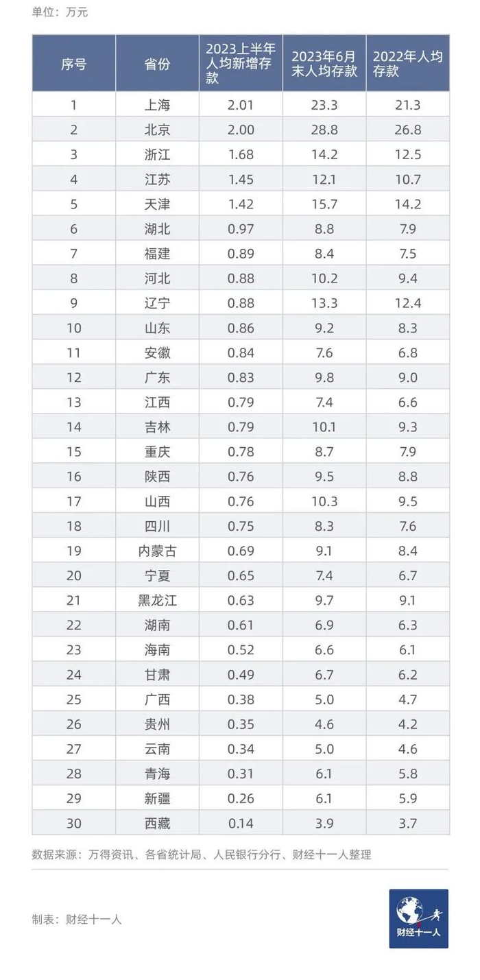 2023年上半年居民新增存款量,超过了2022之前任何一年全年的总量。我们想知道哪个省份的人均存款最多?哪个省份的居民最喜欢以储蓄的形式积攒财富?2023年有哪些新变化?