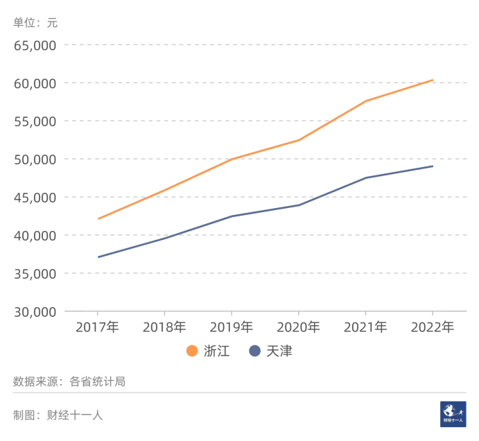 图2: 浙江省和天津市的人均可支配收入(2017年-2022年)