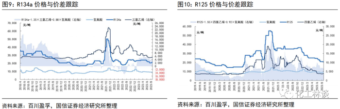 制冷剂:2020-2022年三代制冷剂景气度承压,行业景气度将逐步回升复盘近三年的三代制冷剂价格走势:2020年,受新冠肺炎冲击、基加利修正案引起的配额争抢等因素影响,三代制冷剂市场延续2019年末的疲软态势,各产品价格均有下滑。原料氢氟酸在疫情期间连连走低,于2020年5月份到达全年最低点后反弹回稳。R32产能过剩的状况仍在延续,价格上行受限;R134a价格达到了近年来历史新低点。下游空调、汽车行业2020年产销量双双下滑。2021年上半年,除R32价格仍在成本线下徘徊外,其余制冷剂价格均有所回暖,截至2021年6月30日,R22较年初涨幅约为14.3%,R134a较年初涨幅约为13.9%,R125较年初涨幅约为11.5%,R32较年初跌幅约为4.0%,R410a较年初涨幅约为17.6%。2021年8月,随原材料氢氟酸、甲烷氯化物、乙烷氯化物等价格持续上涨,并且在能耗双控及限电导致制冷剂开工率不足,而需求端制冷剂进入传统备货旺季的背景下,制冷剂产品价格均出现明显反弹,涨价态势持续至2021年11月初。随后,自2021年11月起,在原料端供给逐步释放的背景下,制冷剂价格均开始普遍回调。2022年,制冷剂价格逐步进入下行通道。进入2023年,制冷剂产品价格变化有所分化:R125价格跟随成本四氯乙烯持续下跌、R32价格在中低位震荡、R134价格先抑后扬。2023年厄尔尼诺现象或再度来临,高温天气或将延续,传统需求旺季市场仍将值得期待。目前,《〈蒙特利尔议定书〉基加利修正案》已正式对中国生效。根据协议,到2045年,中国将比2020-2022年基准减少80%的氢氟碳化合物使用。这意味着中国将对HFCs(氢氟碳化物)相关化学品进行管控,包括2024年冻结HFCs生产和消费。2020-2022需求端受疫情反复冲击,下游汽车/空调/家电对制冷剂需求表现疲弱;且处于第三代制冷剂配额抢占的窗口期,供应相对宽裕。目前,我国三代制冷剂产能过剩的格局正逐步缓解。制冷剂中长期需求有望继续增长,同时伴随未来配额即将在立法层面落地,我们看好三代制冷剂价格中枢有望持续提升,制冷剂即将开启景气上行周期。