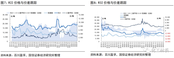 此外,R142b方面,自2021年5月起,R142b作为PVDF的原料,产品价格大幅上涨,产品盈利水平同比大幅提升;然而随着产能持续大幅扩张,2022年3月R142b价格达到顶部20万元/吨后,价格已经步入下行通道,目前市场价为1.9万元/吨,盈利能力已出现大幅缩窄,部分其余企业处于盈亏平衡的边缘。