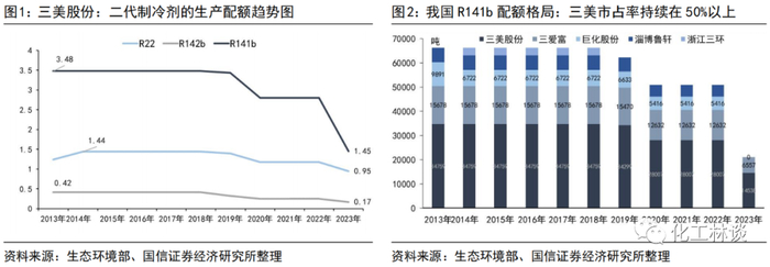 公司现有二代制冷剂R22、R142b、R141b产能分别为 1.44 万吨、0.42 万吨、3.56 万吨,2023年公司生产配额分别为0.95、0.17、1.45万吨,其中R22、R141b产品盈利状况整体较好。其中,针对R141b,2022年12月1日,生态环境部发布关于公开征求《关于禁止生产以 1,1-二氯-1-氟乙烷(HCFC-141b)为发泡剂的保温管产品、太阳能热水器产品的公告(征求意见稿)》意见的函,自 2023 年7月1日起,任何企业不得使用R142b为发泡剂生产保温管产品、太阳能热水器产品。