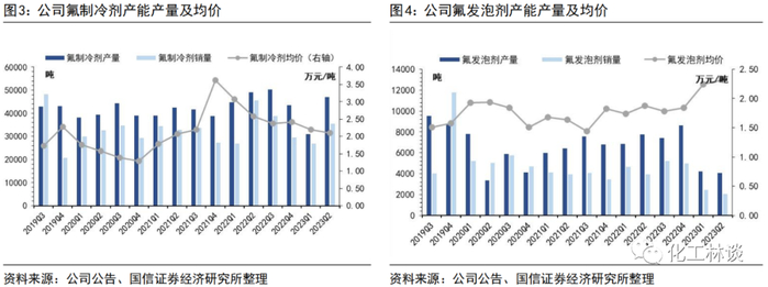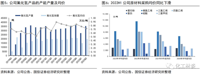 从经营数据上看:原材料方面,2023H1公司原材料采购均价较2022H1同期显著下滑,其中硫酸、氯仿、二氯甲烷、四氯乙烯、三氯乙烯、偏氯乙烯采购均价(不含税)分别为247、2192、2490、5095、5634、8294元/吨,分别同比-79.28%、-46.52%、-38.50%、-41.63%、-29.83%、-42.48%。在原材料的弱支撑下,公司部分主营产品价格也有所下调:2023H1,氟制冷剂、氟化氢均价分别为21,447、 7,446元/吨,分别同比-22.30%、-9.78%。但值得一提的是,受2023年度氟发泡剂配额加速削减等的影响,国内厂家货源相对紧张,下游需求也相对稳定,产品价格走势平稳。2023年上半年,公司实现氟发泡剂的产量、销量分别8,265、4,483吨,均价为22,778元/吨,销量同比2022年上半年减少47.43%,价格则上涨了26.50%。
