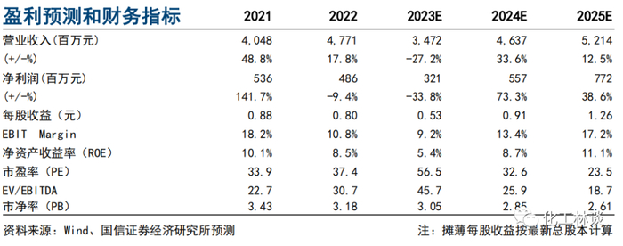 维持 “买入”评级。公司主营氟化工产业布局完善、成本控制能力优秀,且财务结构健康、现金流充裕。目前三代制冷剂产品的价格及价差均已进入底部区间,而配额管理即将在立法层面落地,随着供给侧结构性改革不断深化,行业竞争格局趋向集中,我们看好三代制冷剂有望迎来景气反转的拐点,公司将作为行业龙头引领周期反转。未来,公司将积极布局新材料、新能源等业务领域,并通过子公司向氟化工下游高附加值领域延伸。考虑到R142b景气度出现明显降低,三代制冷剂景气度恢复需要一定过程,我们下调公司2023年盈利预测,并新增公司2024-2025年盈利预测:我们预计公司2023-2025年归母净利润分别3.21/5.57/7.72亿元(前期2023/2024年预测值为11.15/14.79亿元),同比增速-33.8%/+73.3%/38.6%;摊薄EPS=0.53/0.91/1.26元(前期2023/2024年预测值为1.83/2.42元),对应当前股价对应PE=56.5/32.6/23.5X。维持“买入”评级。