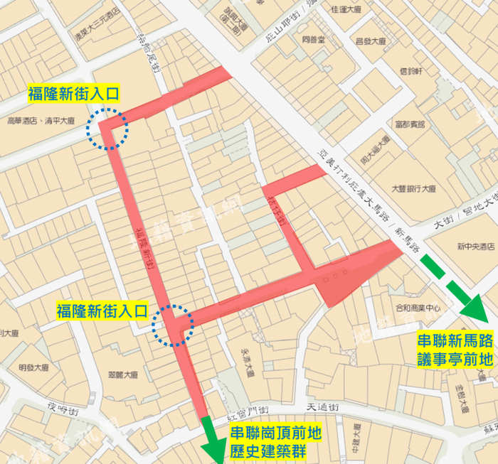 “福隆新街步行区计划”以福隆新街为核心,与周边人流相对密集的新马路、议事亭前地、岗顶前地文物建筑群等核心旅游区串联,创造具活力、艺文氛围良好的休闲旅游体验及舒适的步行环境。