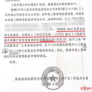 根据陕西省西咸新区沣东新城城中村(棚户区)改造办公室(下称改造办)给西咸新区沣东新城行政审批局的回复文件中明确,薛佩于2014年签订了一份《拆迁安置协议书(住宅)》。在此后西咸新区管委会和斗门街道办的回复中,则称薛佩是于2015年5月27日签订的拆迁安置协议。
