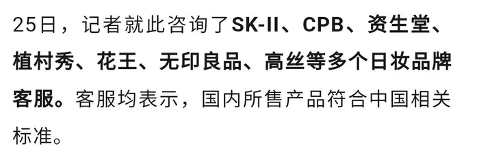 如,SK-II品牌客服表示,所有SK-II产品和成分在上市前都经过严格的产品质量和安全评估。“目前我们在具有检验检测机构资质(CMA)及中国合格评定国家认可委员会(CNAS)认可的第三方检测机构,按照国家检测标准主动对SK-II 产品进行了相关检测,可以放心购买和使用我们的产品。”