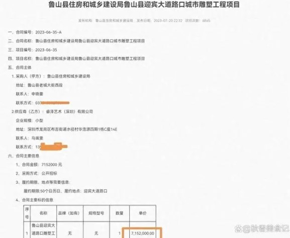记者在平顶山市电子招标投标公共服务平台看到,鲁山县住建局于今年6月14日在平台发布了该雕塑工程项目公开招标公告,预算金额为719万元。7月6日,鲁山县住建局又在平台发布了中标公告,中标单位为睿泽艺术(深圳)有限公司,中标金额为715.2万元,采购内容包括原址地点石块迁移、运输及安装处理,和雕塑的设计、制作、运输、安装等全过程。公告还显示,雕塑高17米,宽15米,采用铸铜、锻造、浮雕及着色相结合的形式制作而成,展现了鲁山文化之城、旅游之城的新形象。
