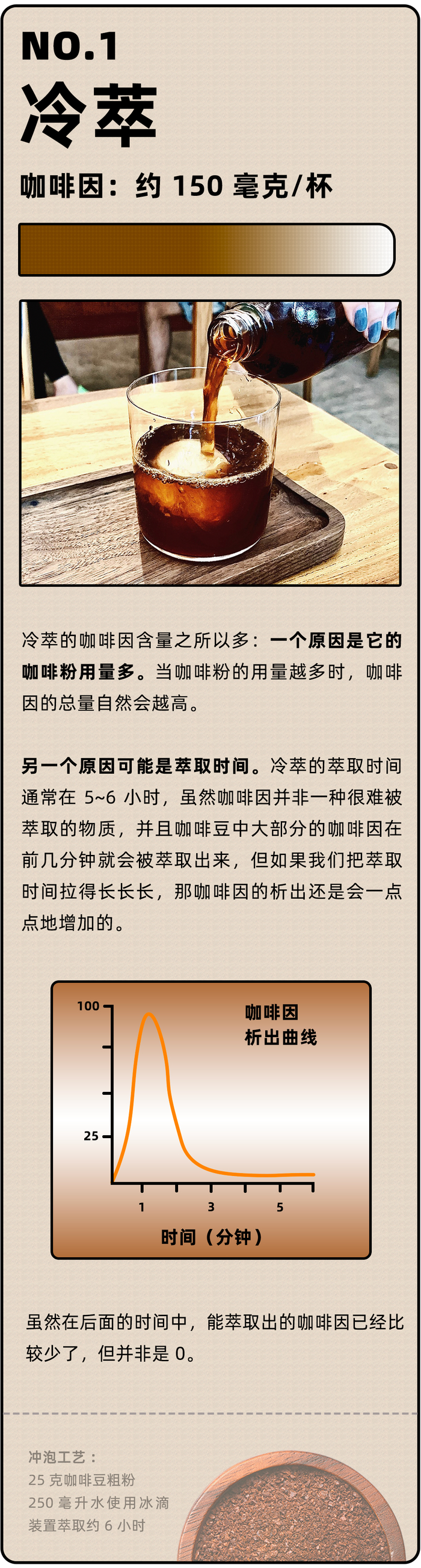 比如当下非常热门的,几乎每个咖啡店都在做的冷萃咖啡,它的咖啡因含量就挺高。