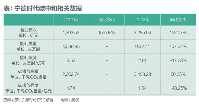 宁德时代从2021年开始发布环境、社会与公司治理(ESG)报告,在2021年和2022年的两份报告中给出了详细的能耗和碳排放数据。从数据中不难发现,宁德时代的能耗和碳排放总量增速显著低于营收增速,单位营收能耗强度和碳排放强度都在下降,特别是碳排放强度,2022年下降超40%。