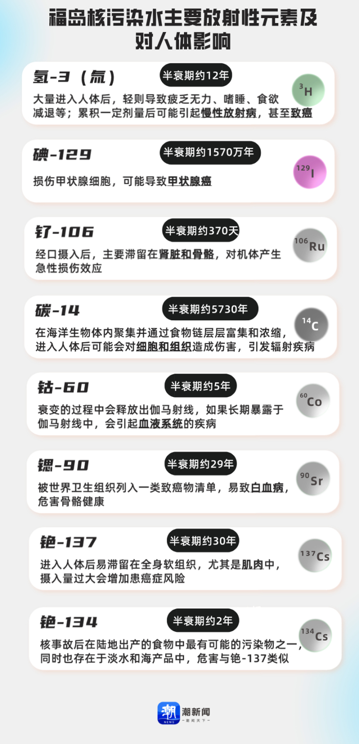 据四川省原子能研究院质量安全部部长李春宏介绍,根据东京电力公司2018年发布的数据,福岛核污水存在的放射性元素中,氚的含量最高,其次还有碘-129、钌-106、碳-14、钴-60、锶-90、铯-134、铯-137等物质。