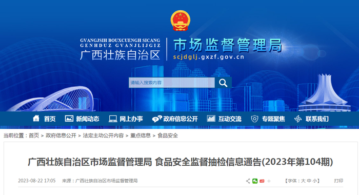 广西市场监管局食品安全监督抽检信息通告(2023年第104期)