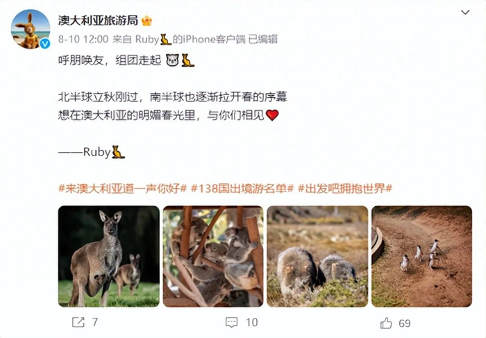 “北半球立秋刚过,南半球也逐渐拉开春的序幕,想在澳大利亚的明媚春光里,与你们相见”……在得知“榜上有名”后,澳大利亚旅游局随即在官方微博中向中国游客发出邀请。据澳大利亚旅游局预测,赴澳大利亚旅游的中国游客数量将在2026年恢复至疫情发生前的水平。