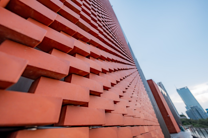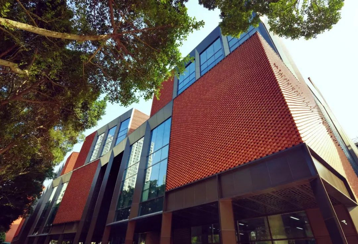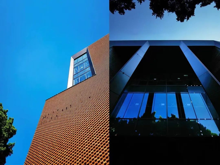 项目充分考量了广州老街区的城市肌理,应用附近南越王宫博物馆相似色调的雅韵红砖墙,配以来自于岭南木窗花纹样的雕花铜屏,呈现出契合越秀老城文化底蕴、如同博物馆般地独特外立面。