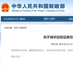 财政部、税务总局8月27日发布关于减半征收证券交易印花税的公告。公告称,为活跃资本市场、提振投资者信心,自2023年8月28日起,证券交易印花税实施减半征收。