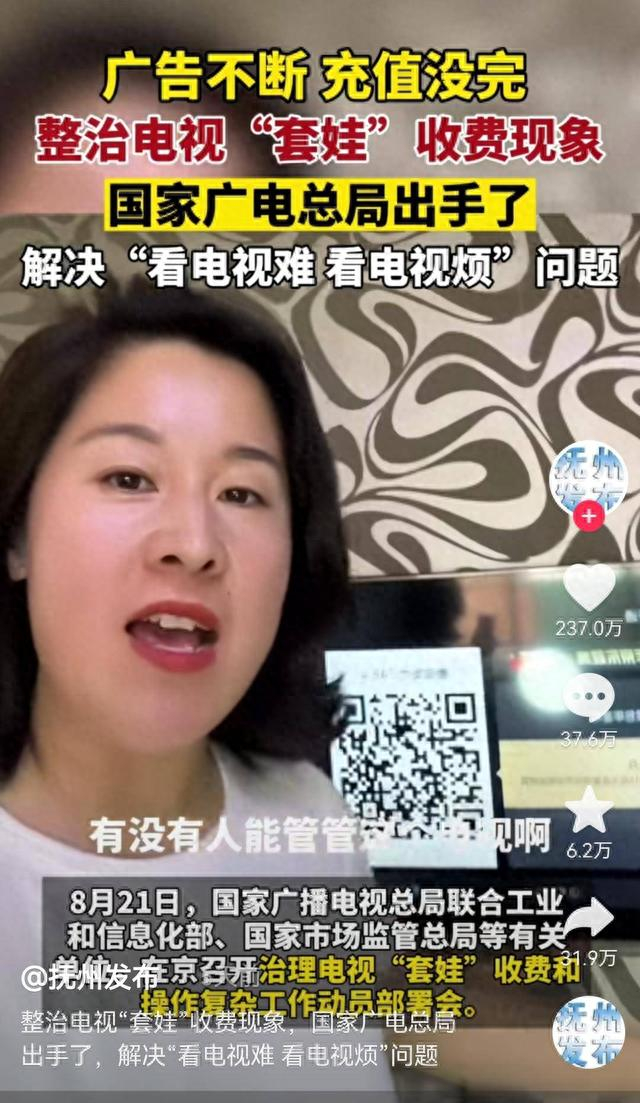 近日短视频平台上,一则吐槽电视收费的视频有237万人点赞。8月21日,对于备受诟病的电视“套娃”收费乱象,国家广播电视总局联合多部门出手整治,正是及时雨。
