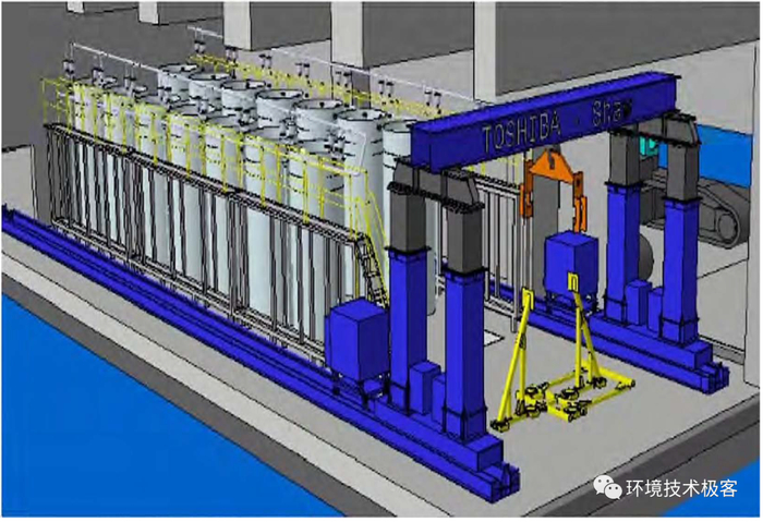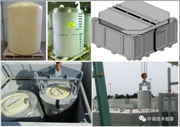 不锈钢增强后的高密度聚乙烯整体容器(HIC)存放在具有屏蔽辐射性能的防水混凝土箱体中,同时设置吊钩吊环方便远程控制起吊运输,混凝土箱体整体暂存于临时设施中。该防水混凝土箱体中设置辐射泄露检测装置以防止污泥泄露。根据东电确认,在HIC表面具有最高剂量(14mSv/h)条件下,HIC的整体完整性可以保证10年。