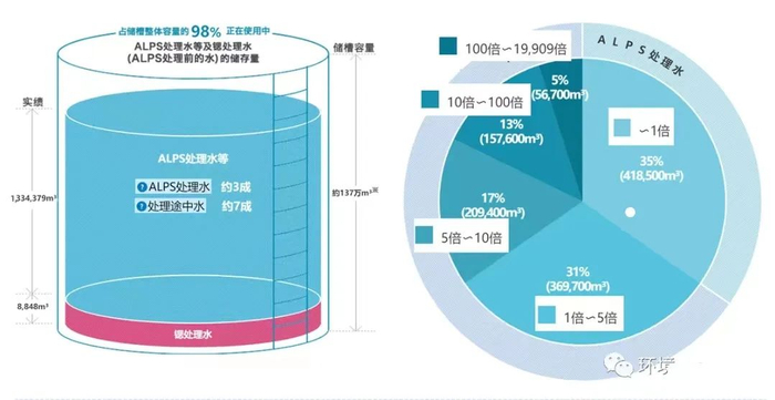 但是,由于设备运转初期问题及处理时期运用方针的不同等,目前各告示浓度比总和的储存量如上图图所示。仅有35%,即41.85万方的经过ALPS处理的废水的告示浓度比总和小于1倍。