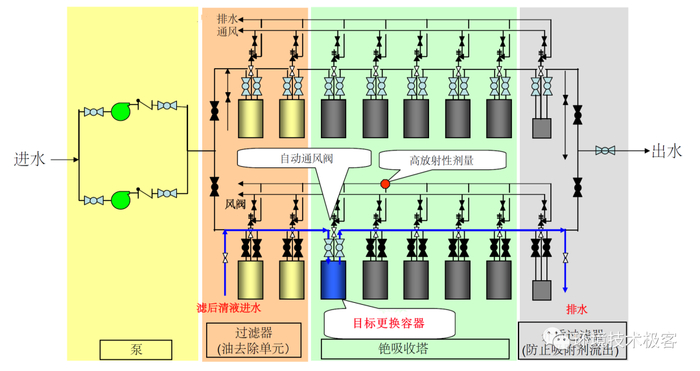 SARRY系统使用的无机离子吸附剂材料,意味着每当吸附塔单元达到吸附能力上限或不能满足设计要求时,就需要整体更换新的吸附塔单元。而被更换下来的单元会作为放射性废物进行处理。但是,为了最大化利用旧和新吸附塔单元,可以通过调整流经它们的顺序来实现。如上图所示,这种调整可以确保所有吸附塔单元都能有效地利用。