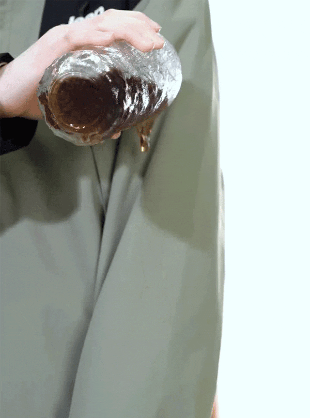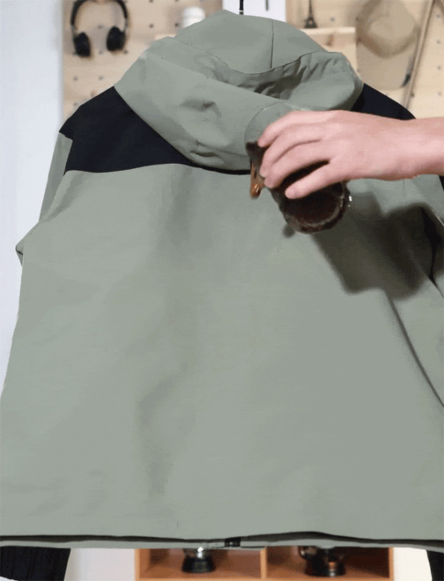 我们让小伙伴穿上冲锋衣,直接往衣服上泼水。