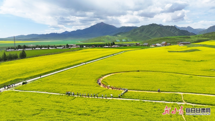 7月24日,张掖市民乐县扁都口生态休闲景区进入盛花期,铺天盖地且层次丰富的油菜花田犹如一条金色花毯,与远处的祁连山和镶嵌其间的国道227线遥相辉映,让游客沉醉其中,呈现出一幅多彩田园画卷。