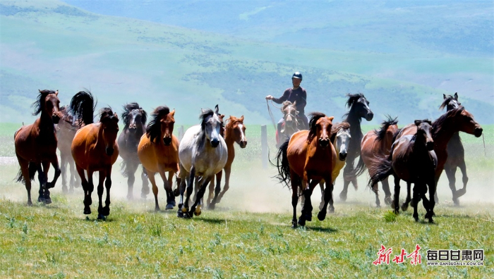 7月25日,位于祁连山北麓的张掖市山丹马场草原绿草如茵,牧马人放牧途中,奔跑的马群再现骏马奔腾美景,吸引了众多游客驻足观赏。
